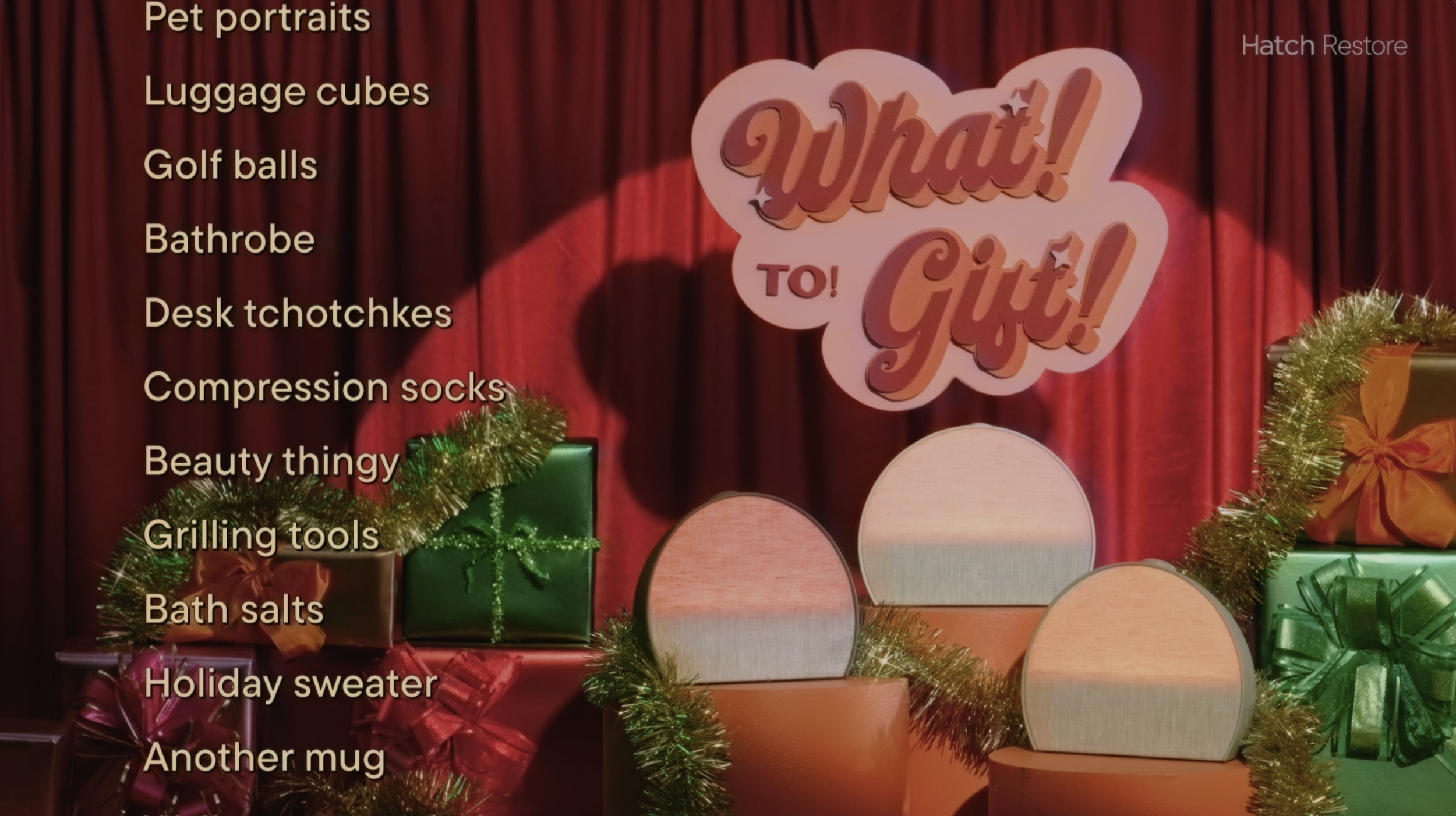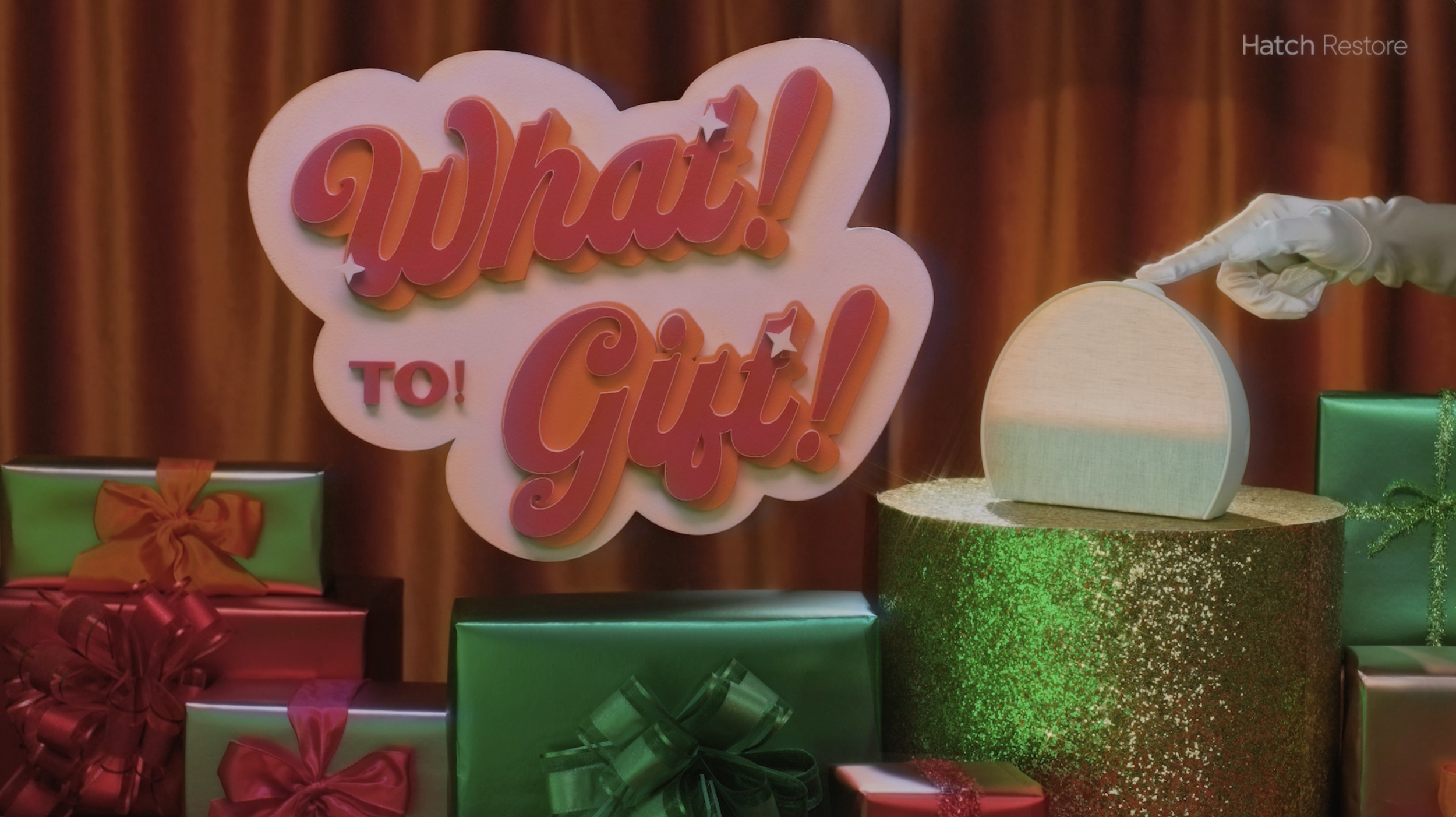 For Holiday 2025, we developed What!To!Gift!, a campaign styled as a retro holiday game show that cut through tired gift guide culture and positioned Hatch Restore as the gift everyone actually wants. The concept leaned into the universal frustration of holiday shopping, scrolling endlessly and settling for the forgettable, and reframed Restore as the thoughtful, practical answer for every type of person on your list. To prepare for the shoot, I explored 70s game show set design and decoration in Midjourney, creating a visual reference guide to align our photographer and stylist on the look and feel before we got on set.